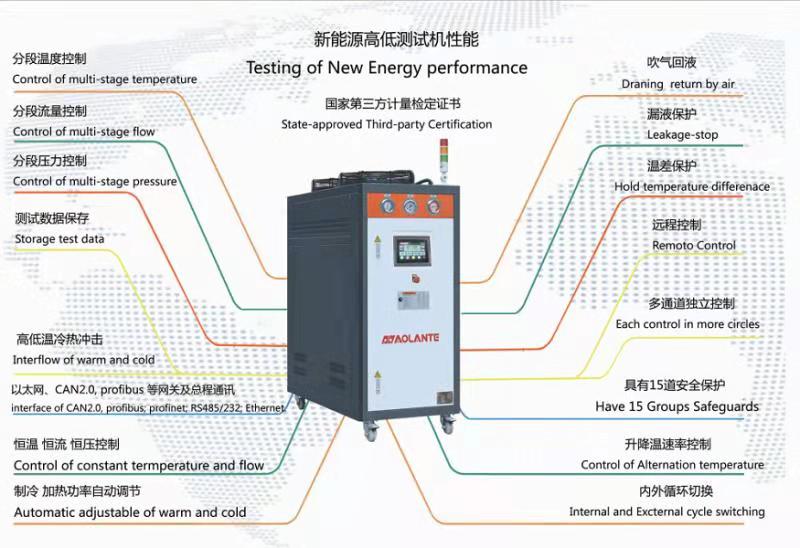 深圳奧蘭特機(jī)械新能源高低溫測(cè)試功能齊全,并且計(jì)量精度都是經(jīng)過國(guó)家第三方計(jì)量檢測(cè)機(jī)構(gòu)檢驗(yàn),并取得檢定證書。在設(shè)備的流量控制、壓力控制、溫度控制精度都媲美進(jìn)口設(shè)備。奧蘭特高低溫測(cè)試機(jī)功能多樣化,,具體有分段流量控制、分段溫度控制、分段壓力控制、制冷加熱功率自動(dòng)調(diào)節(jié)、自動(dòng)補(bǔ)液、吹氣回液、漏油報(bào)警、升降溫速率控制、單系統(tǒng)多通道獨(dú)立控制,擁有強(qiáng)大的通訊功能:485通訊、以太網(wǎng)、MODBUS、PRPFIBUS、CAN2.0,讓設(shè)備可以便捷的和主輔設(shè)備進(jìn)行通訊遠(yuǎn)程控制。深圳奧蘭特機(jī)械于國(guó)內(nèi)外眾多的新能源汽車廠家、檢測(cè)機(jī)構(gòu)、汽車研究所都已經(jīng)進(jìn)行深度合作。
